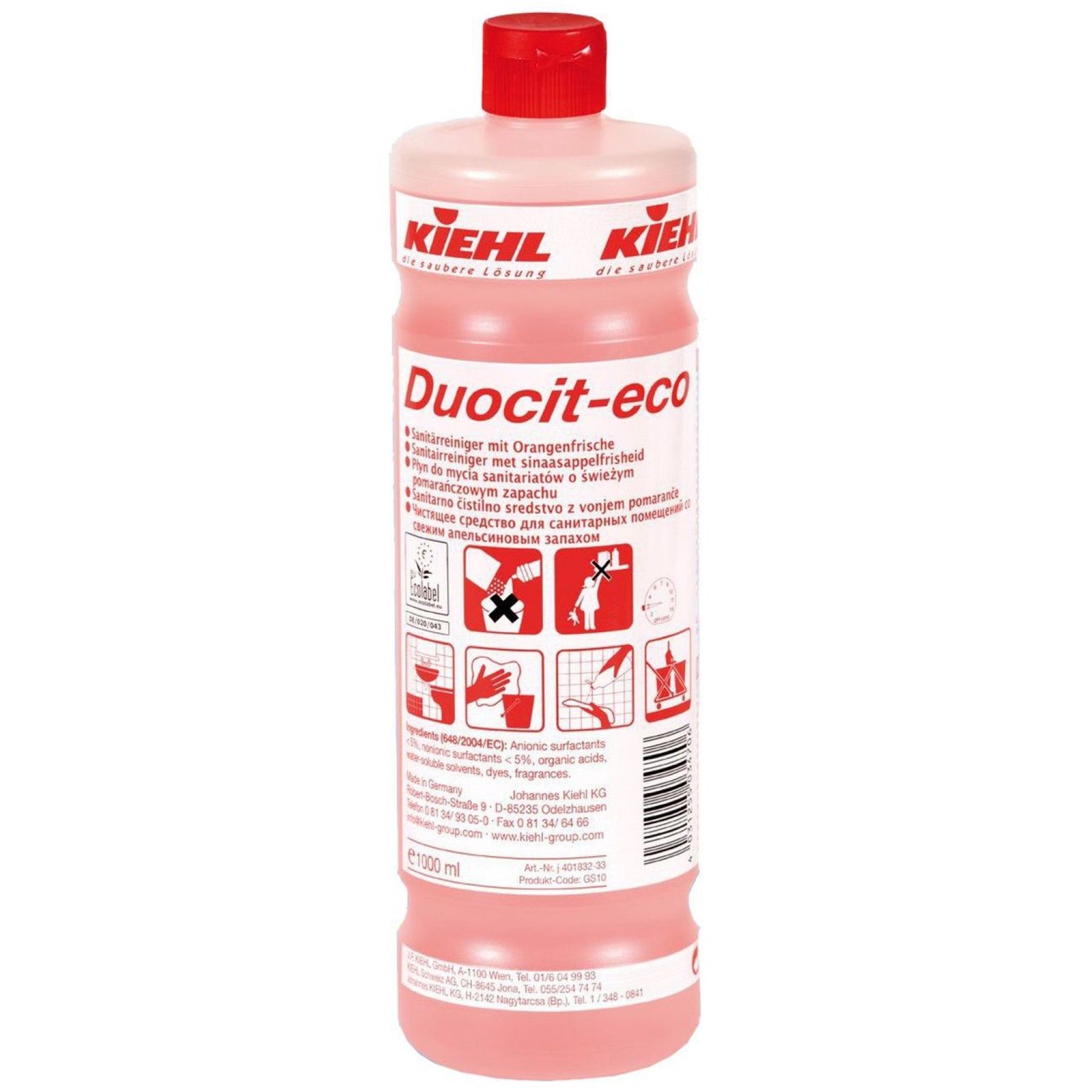 Mit Kiehl Duocit-eco Sanitärreiniger setzen Sie auf Qualität, Effektivität und einen frischen Duft für einen hygienischen und angenehmen Sanitärbereich. Gönnen Sie sich und anderen das Erlebnis von Reinheit und Orangenfrische.